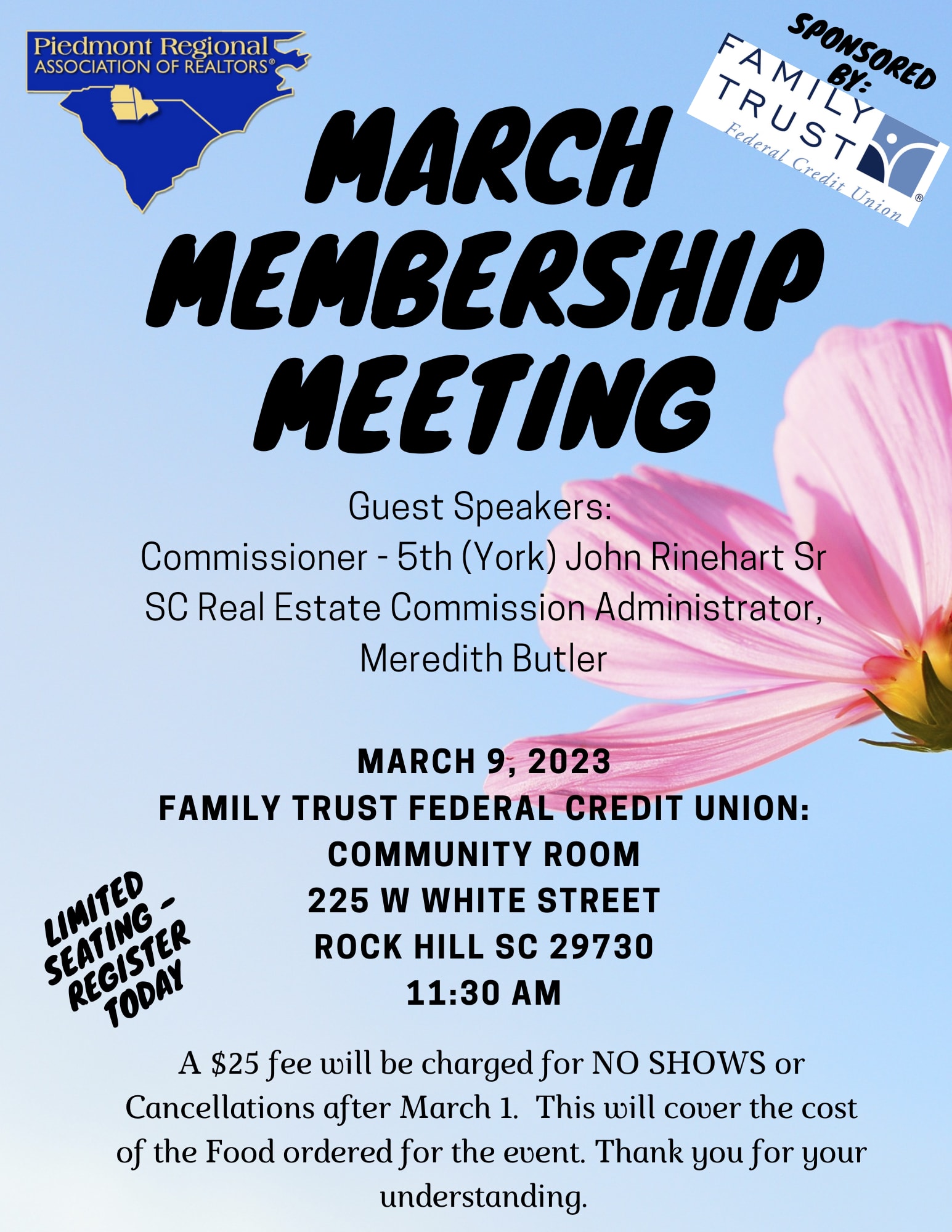 The EVENT if FREE for Members. However there will be a $25 NO SHOW Fee or Cancellation fee charged for cancellations made after March 1 to cover the cost of the FOOD ordered! Thank you for understanding.